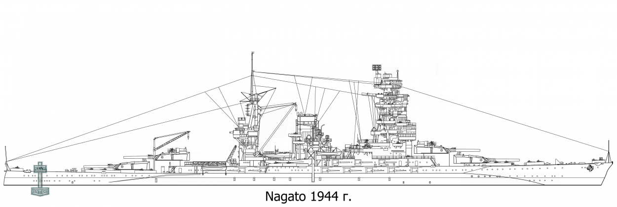 10 июня 1944 г. линкор «Nagato» прошел ремонт, в ходе которого на корабле была установлена новая радиолокационная станция (Type 21) и установили 25-мм двуствольную зенитную установку. Однако данная РЛС была признана неудачной и уже в июле были установлены новые РЛС (Type 22 и Type 13). Зенитное вооружение линкора довели до 96 стволов 25-мм автоматов. Двадцать восемь были одиночные, десять двуствольных и шестнадцать трехствольных. Для компенсации веса пришлось демонтировать два 140-мм противоминных орудия.